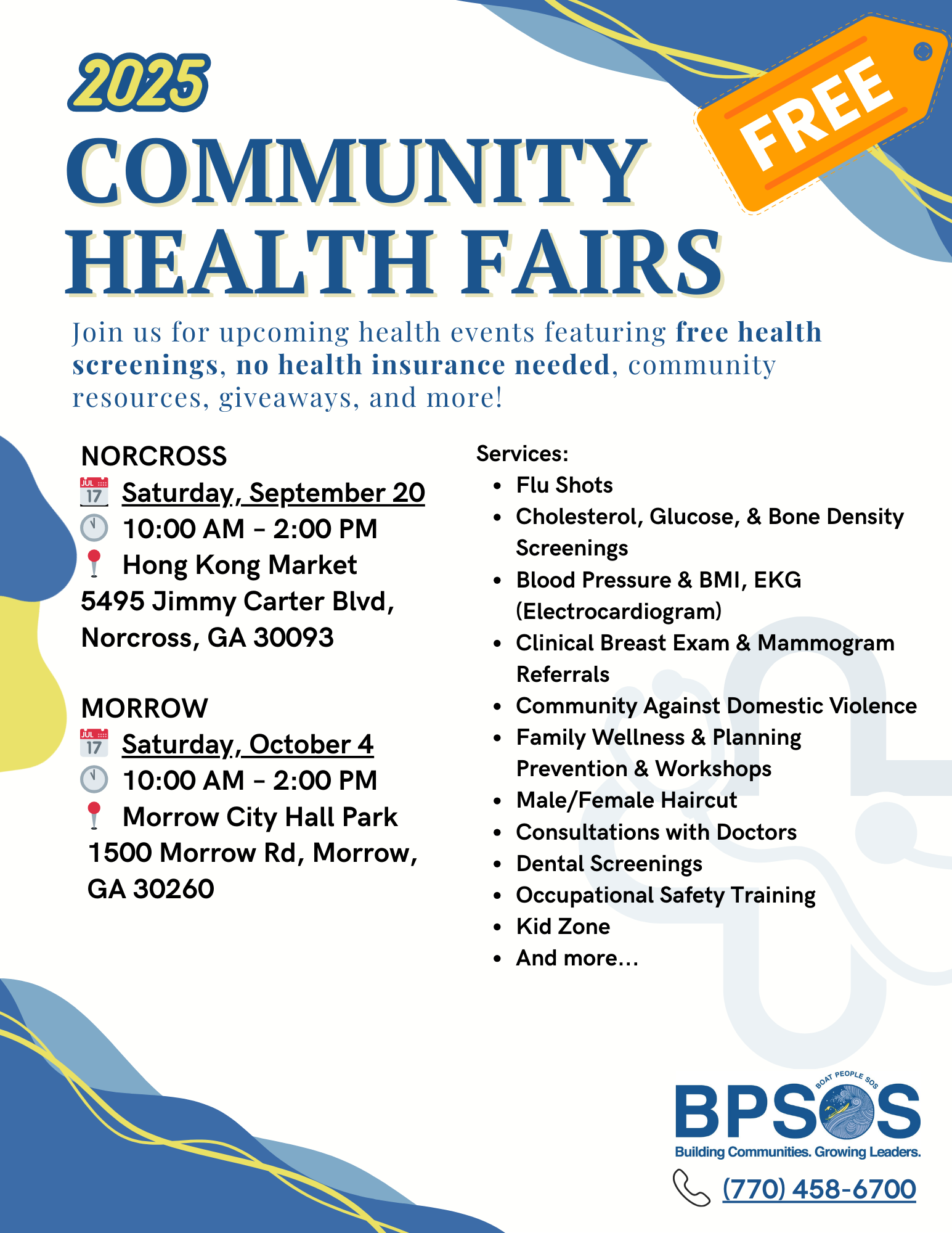 Join us for the 2025 Annual Health Fair! This community event is designed to provide you with essential health services and information. We offer important health screenings, vaccination opportunities, educational workshops, and a variety of resources to support your well-being. With over 45 vendors, onsite examinations, and mobile health units, this event is a great opportunity to get valuable health advice and connect with healthcare professionals. Open to everyone, including those who are uninsured or underinsured, the Health Fair offers a welcoming environment for all.